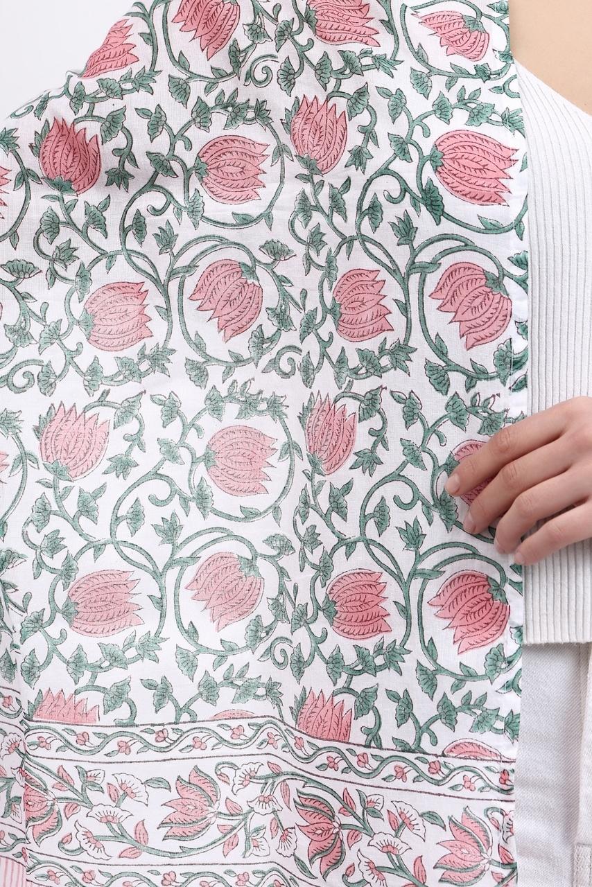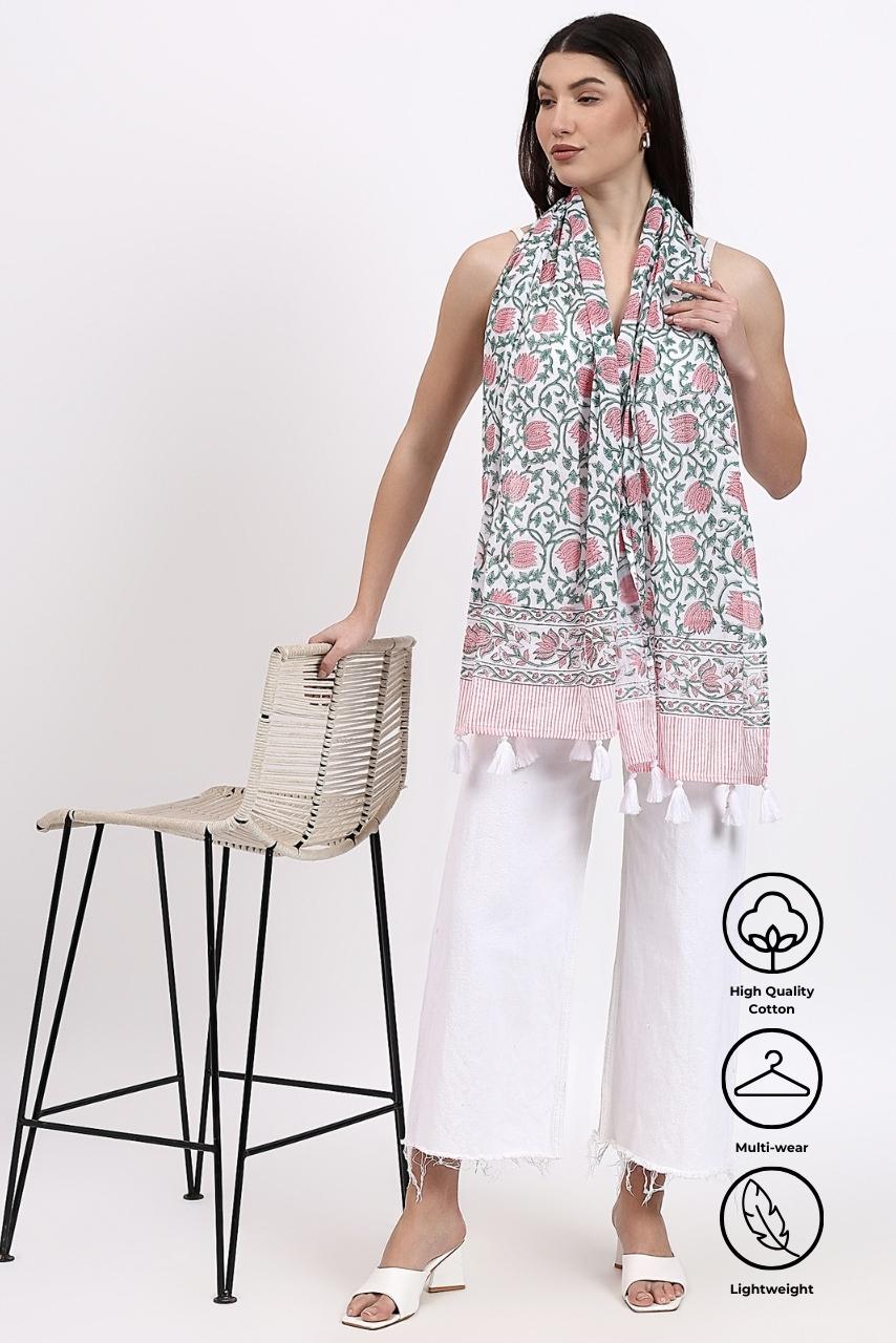 Delicate Florals: This block print features intricate floral designs on soft, airy cotton, offering a light and effortless styling. The contrasting tassels to elevate your look while you stay wrapped up.