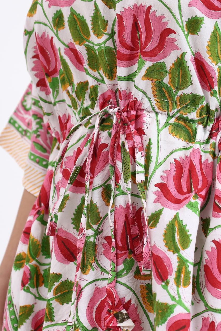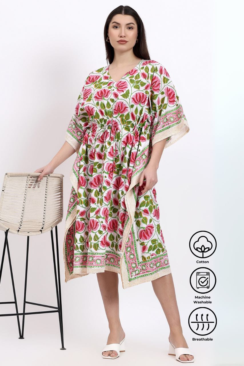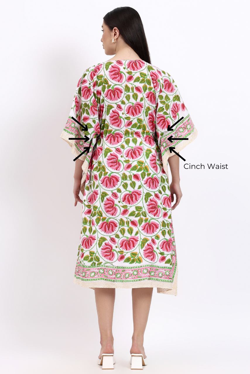 - Blooming Print: This new block printed kaftan features strategically placed panels on the outside hem. The design creates a balanced silhouette, enhancing an hourglass effect and elegantly defining your curves.
