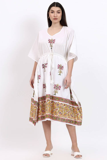 - Elegant Palm Print: This new block print kaftan features strategically placed panels at the bottom. The design creates a balanced silhouette, enhancing an hourglass effect and elegantly defining your curves.